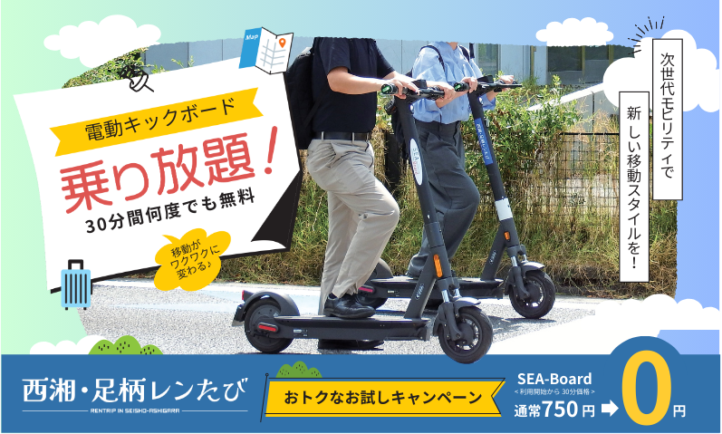 神奈川県西部の2市8町(小田原市、南足柄市、中井町、大井町、松田町、山北町、開成町、箱根町、真鶴町及び湯河原町)からなる西湘・足柄エリアの周遊促進、移動の利便性向上と環境にやさしい交通手段の普及を目的に、電動キックボードや電気自動車のシェア・レンタルサービスを活用した新しい周遊プログラム「西湘・足柄レンたび」を開始します。